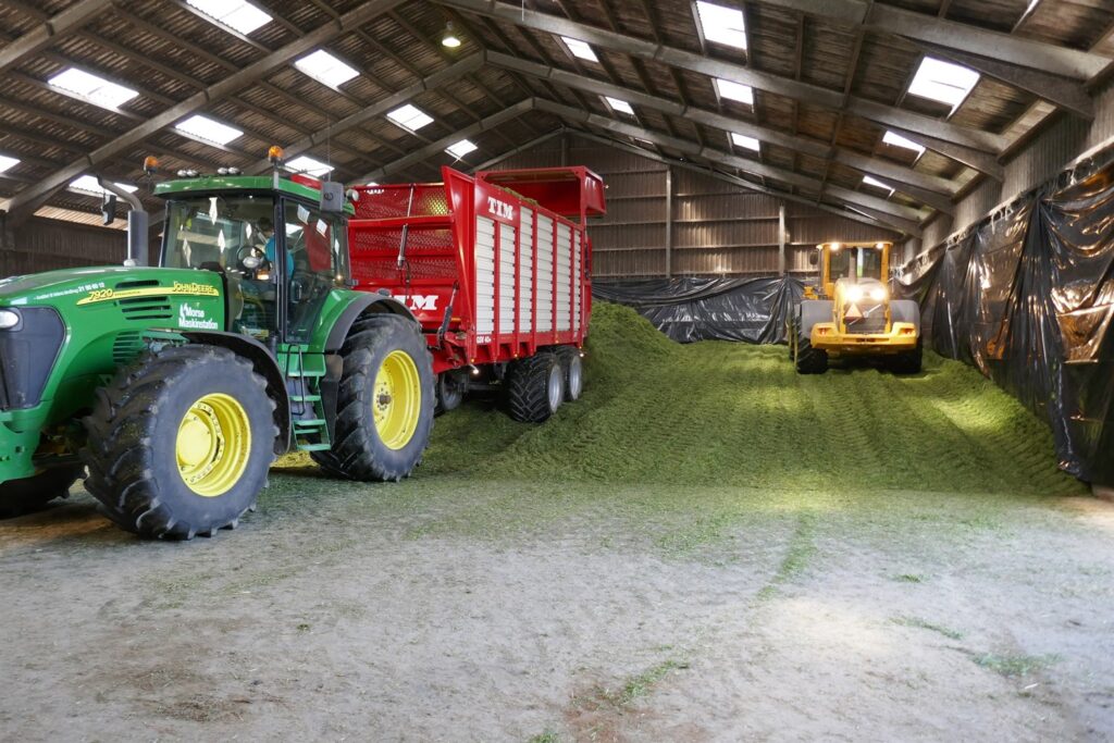 Ensileringen kører vi med en John Deere 8500i finsnitter og 2 40+m3 Tim græsvogne klarer hjemtransporten, naturligvis med drejbar boggie og